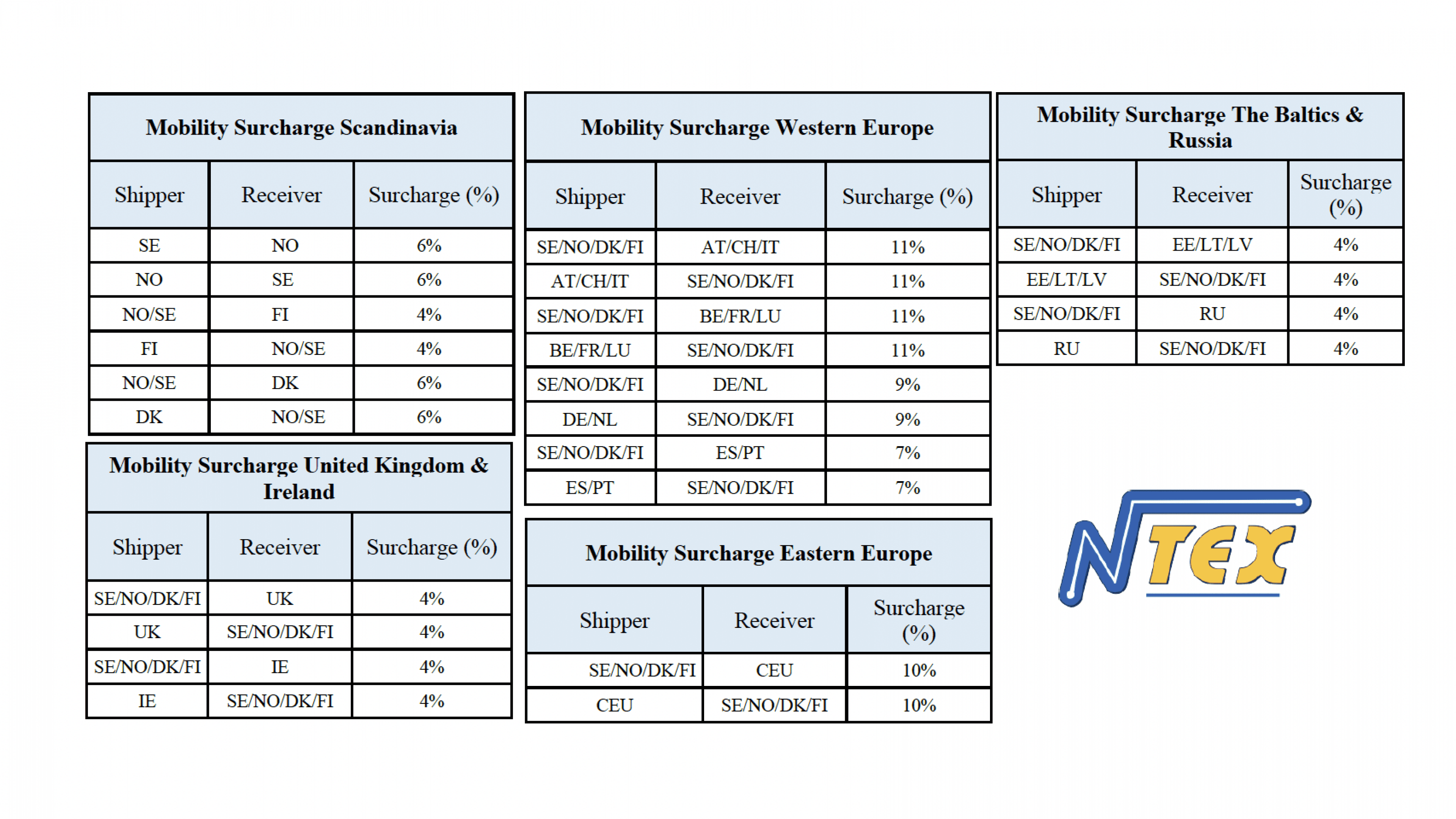 A Mobility Surcharge will be applied as per 2022-03-01 as a result of the implementation of “EU´s Mobility Package phase 2”.